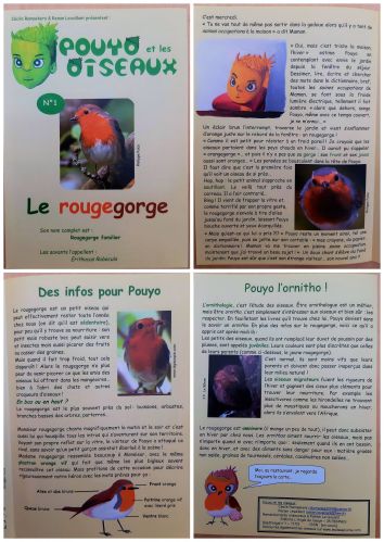 En 2003, j’ai eu l’occasion de participer à la publication des premiers numéros d’un dépliant appelé « Pouyo et les oiseaux ». Le Rougegorge était le premier oiseau sur lequel nous avons travaillé. Entre dessins, photos (de plusieurs personnes passionnées), petite histoire pour enfants et informations scientifiques, ce petit passereau de nos jardins et de nos bois a été présenté ainsi.