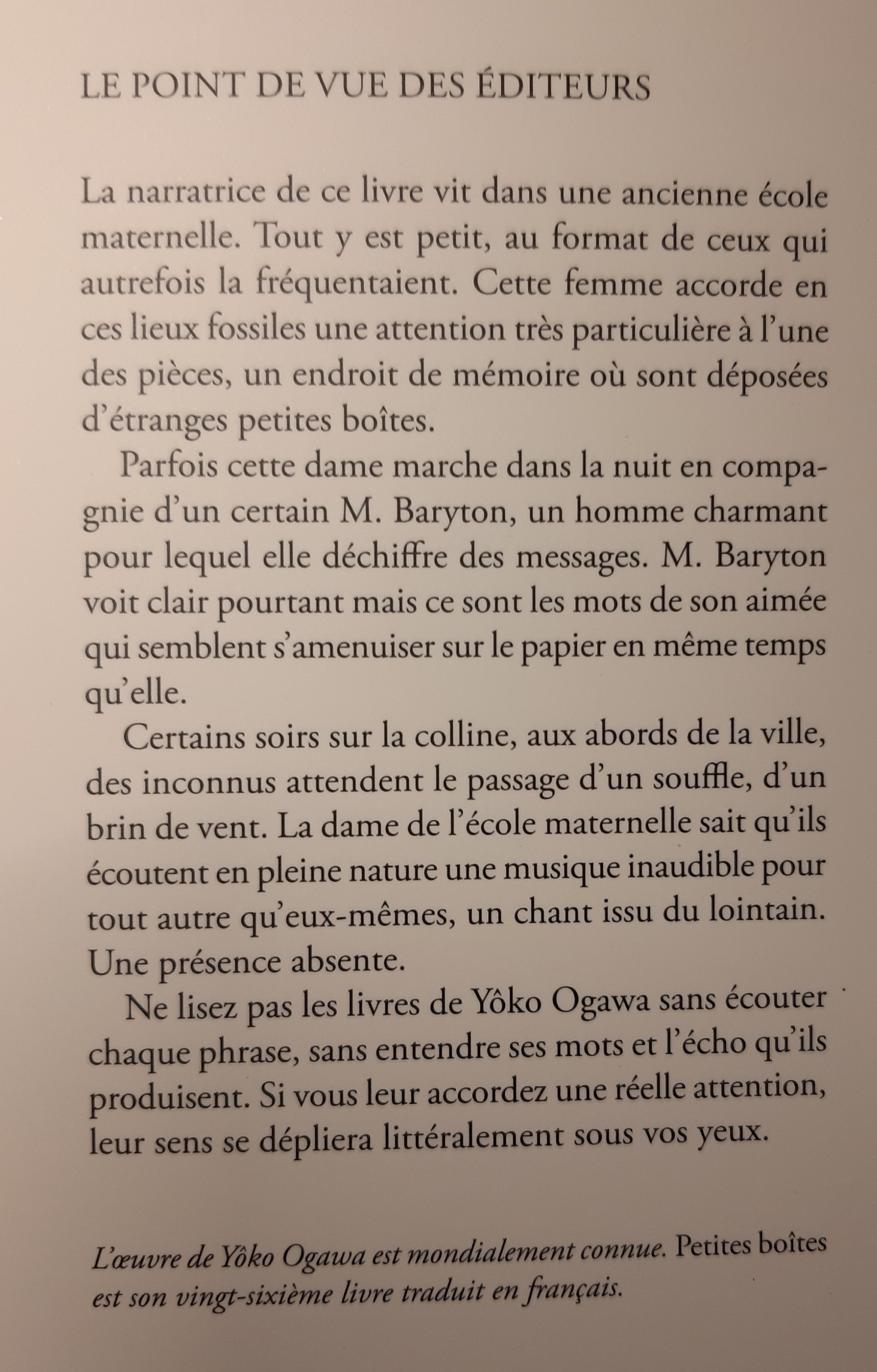 » Petites boîtes, par Yôko Ogawa, traduit du japonais par Sophie Refle. Éditions Actes Sud.