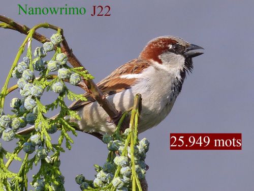 Nanowrimo J22. Je n’ai pas écrit tous les jours. Je n’arrive plus à intégrer autant de titres de livres, car mon histoire s’écrit presque toute seule à présent (les titres de livres que je tiens à inclure, sont pour moi des « démarreurs » en cas de panne d’inspiration). Je vois la fin, mais pas encore la manière dont tout ça va s’agencer. J’en suis, je pense, au trois-quart de mon histoire, et il n’y a pas encore eu de rebondissement, d’intrigue, de mystère. Pfff ! Mais pour terminer ce soir ma période d’écriture, je viens enfin de mettre des mots, de faire arriver une confrontation entre le méchant pas très méchant et mon héroïne qui s’efface un peu. Donc soit, je n’en suis qu’à la moitié de l’histoire et il va falloir que je trouve d’autres idées, d’autres rencontres, d’autres quêtes ou je ne sais quoi, soit je la clôture rapidement, sans y revenir maintenant, mais en sachant que je vais la relire et la retravailler ultérieurement.