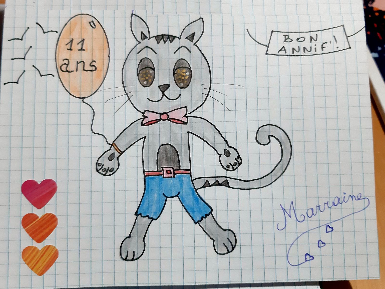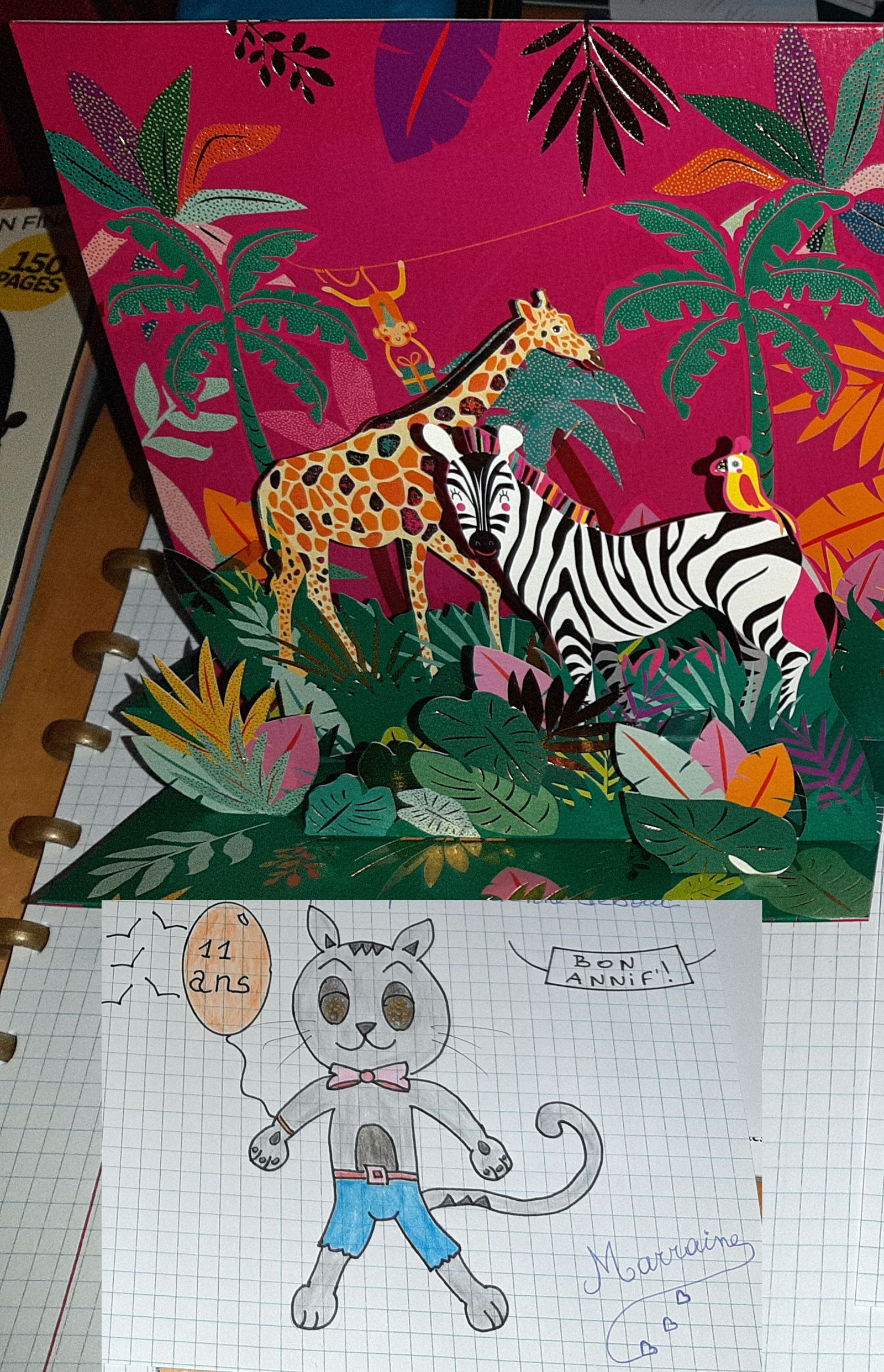 Et puis, dzing ! je me suis souvenue que c’était bientôt l’anniversaire de mon filleul Togolais : Gédéon ! Comme le courrier met quinze jours à trois semaines pour arriver à destination, vite, j’ai acheté une carte et ce matin, zou ! je lui ai écrit et … fait un petit dessin :-)