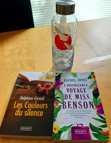 - À l’achat de 2 livres de Pocket Éditions, je recevais une gourde en verre avec un super chouette motif !