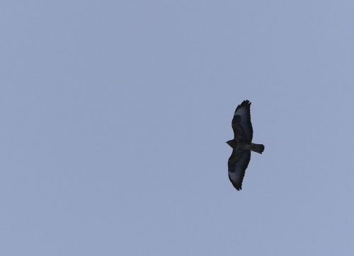 Je ne sais pourquoi, après cette séance de shooting, je lève la tête. Bingo, pile à ce moment-là, un rapace haut dans le ciel se laisse planer ! Le temps de deux photos (trois en réalité mais la première est floue, bonne pour la poubelle), et il est déjà trop loin pour moi. Je lui trouve les ailes bien larges. Bondrée ? Buse ? Autre ?
