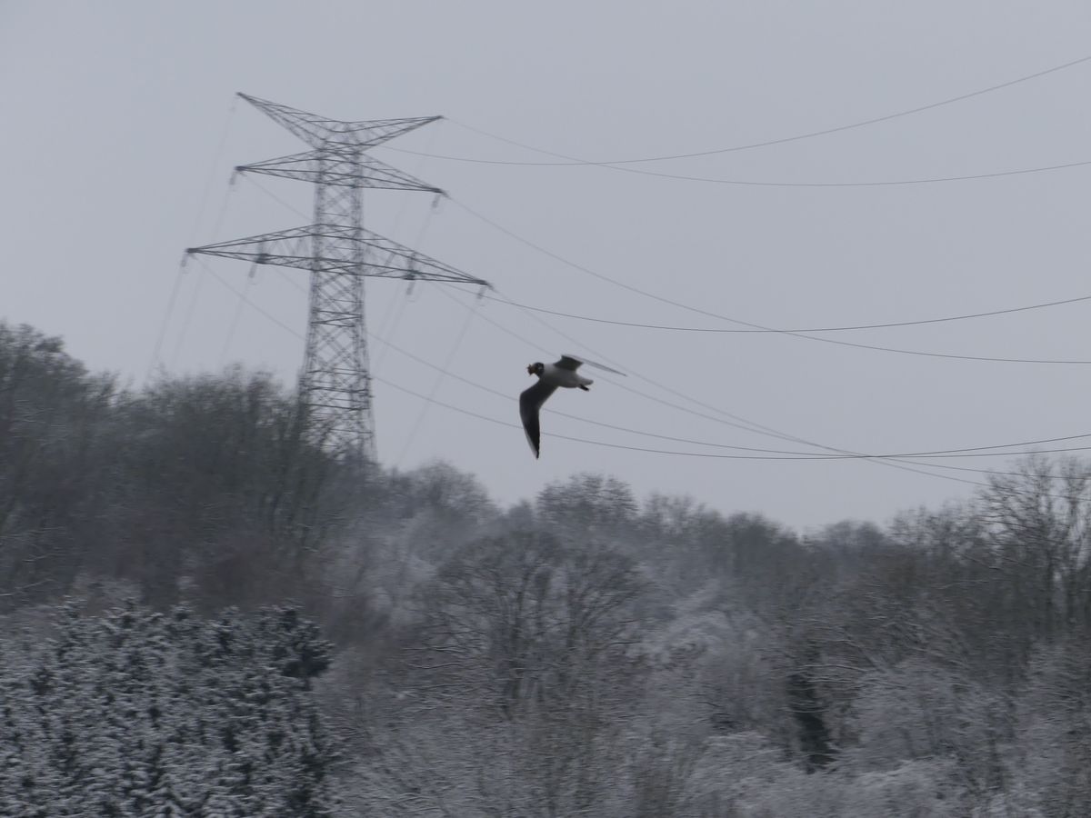 Oh ! Un grand cormoran en vol. Lui aussi, d’habitude visible couramment ici, n’est que peu présent en ce milieu de matinée hivernale.