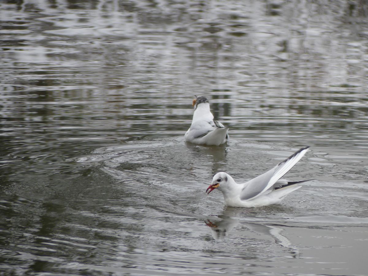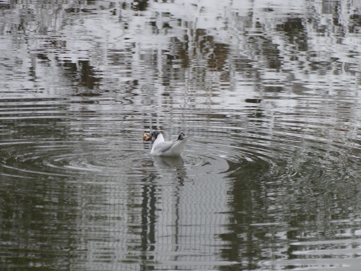 Quelques mètres plus loin, un rire éclate : une mouette a réussi à attraper quelque chose, un aliment d’assez belle taille. Trognon de pomme ? Morceau de pain ? Autre ? Je l’ignore. J’ai le temps de prendre deux photos, mais le butin reste indéterminé à mes yeux. Chez ces oiseaux, quand l’un a trouvé quelque chose à becqueter, il se fait aussitôt harceler par ses copains – non pour partager, mais pour se faire voler le trésor. S’ensuivent des acrobaties aériennes délicieuses à observer. J’ai toujours le secret espoir que celui ou celle qui a découvert le mets parvienne à échapper à la poursuite. Mais c’est rarement le cas : le butin, s’il n’est pas volé, est tombé, rattrapé ou ramassé par un autre qui n’attendait que ça ! Le chanceux est à son tour poursuivi… Et ainsi de suite. Ça peut parfois durer très longtemps !