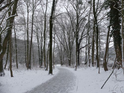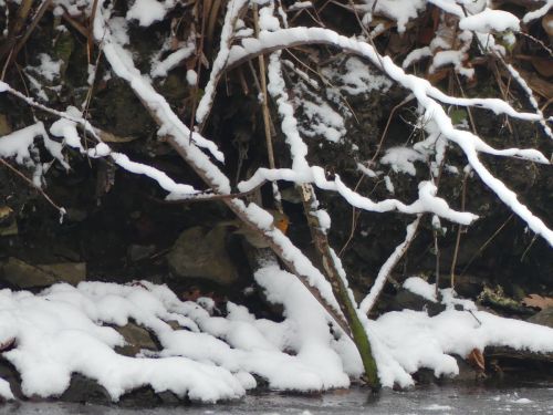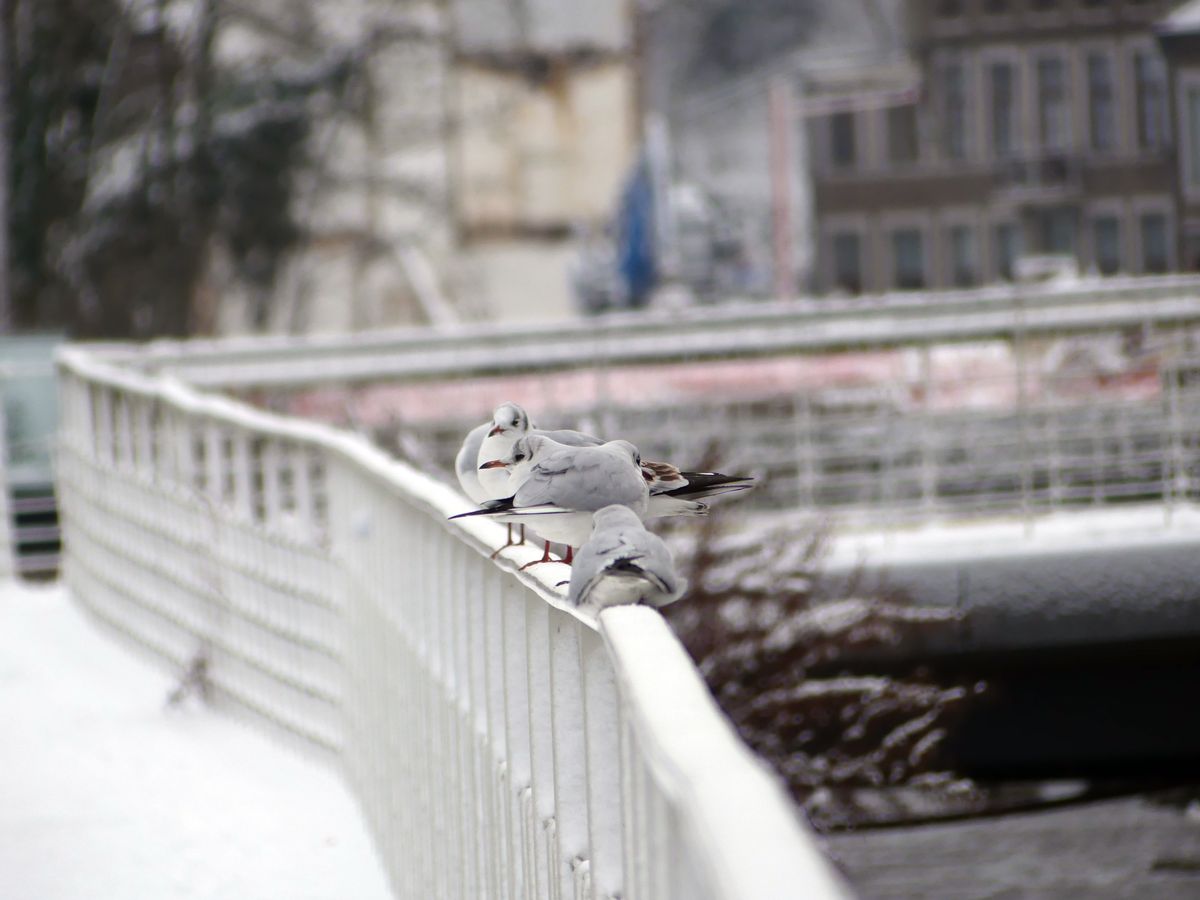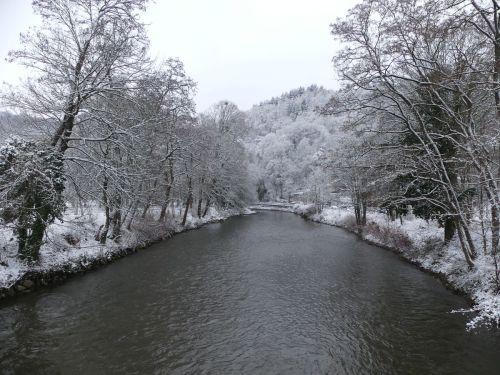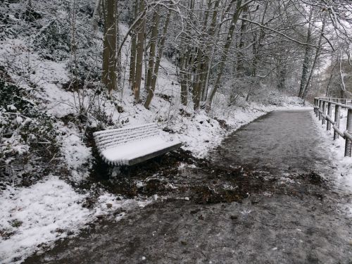Le paysage, les arbres, la vie, le parc, le sol… tout est blanc. Silencieux, hormis les voitures sur la route de l’autre côté de la Vesdre. Et puis, les oiseaux chantent. Peu et brièvement, mais ils sont là. Une discussion vient rompre ce charme : un couple parle et leurs voix portent loin. Désagréable pour moi.