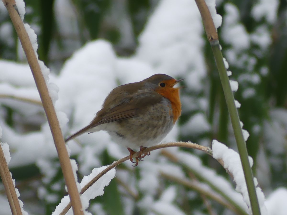 C’est à cet instant qu’un rouge-gorge (le même ou un autre ?) se pose à moins de trois mètres de moi et chante. Il n’a pas l’air d’avoir peur et reste là, face à moi qui le mitraille un peu trop. J’ose avancer de quelques centimètres. Une ou deux photos avec le zoom moins poussé. Encore quelques centimètres et quelques photos plus tard, je finirai par être certaine d’avoir réussi au moins deux beaux clichés de ce chanteur d’hiver. Je le remercie pour sa générosité, je souris et poursuis mon chemin.
