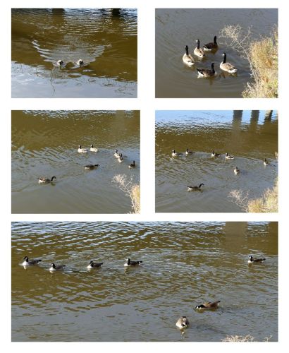 Tout au bord, près de moi donc (mais comme il n’y a pas de barrière à ce niveau, je ne m’approche pas trop près du bord), un groupe de cinq bernaches. Et les deux qui arrivent sont clairement les chefs. Ou les parents ? Dès qu’ils arrivent près du petit groupe, ce dernier se disperse et s’éloigne. Lentement, mais sûrement. À gauche, un troisième petit groupe arrive en file indienne. J’aime les couleurs, le jeu d’ombre et de lumière, je fais donc une photo. Ou un peu plus…