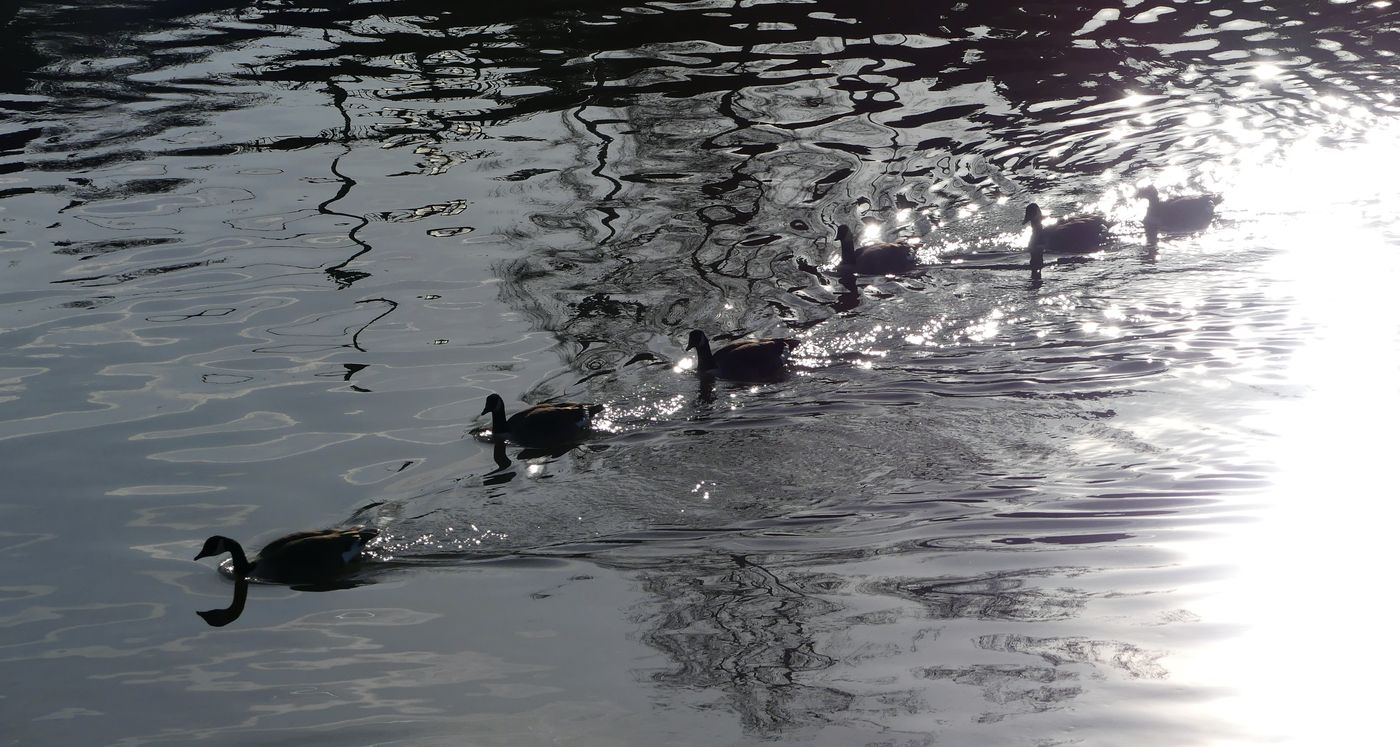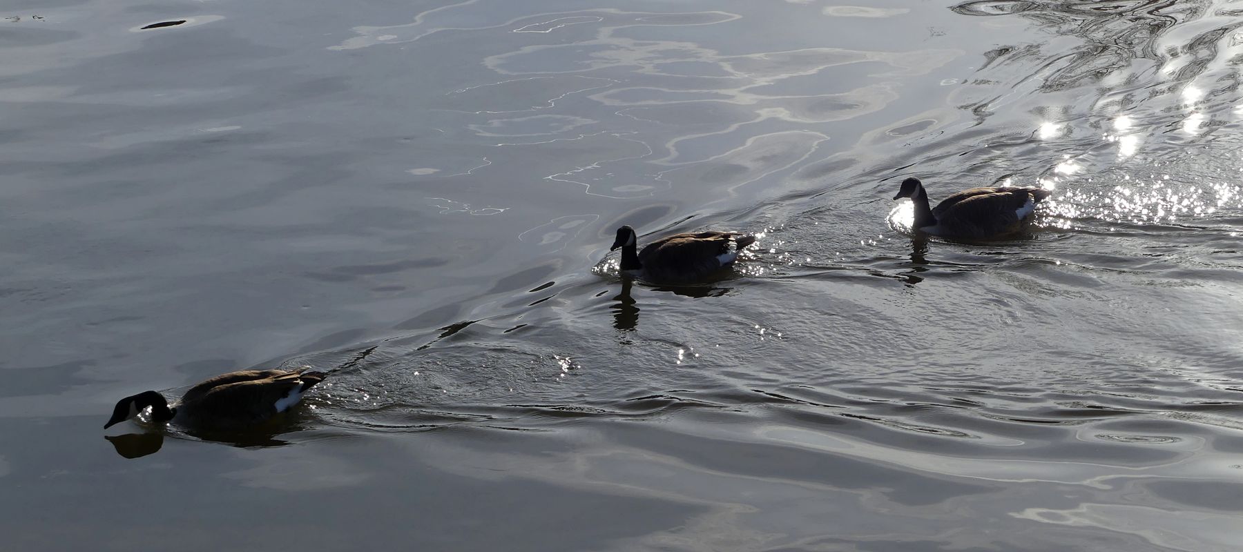 Je redescends au bord de l’eau. Un monde fou, fou, fou. Un week-end ensoleillé comme celui-là et ça fourmille d’humains en manque de vitamine D. Les bernaches du Canada ne me contrediront pas. Là aussi, deux ou trois clans. Je vois arriver deux individus, fendant les flots d’une allure cadencée, dans ma direction. Je crois que ces deux-là viennent pour moi, mais je me fourvoyais complètement.