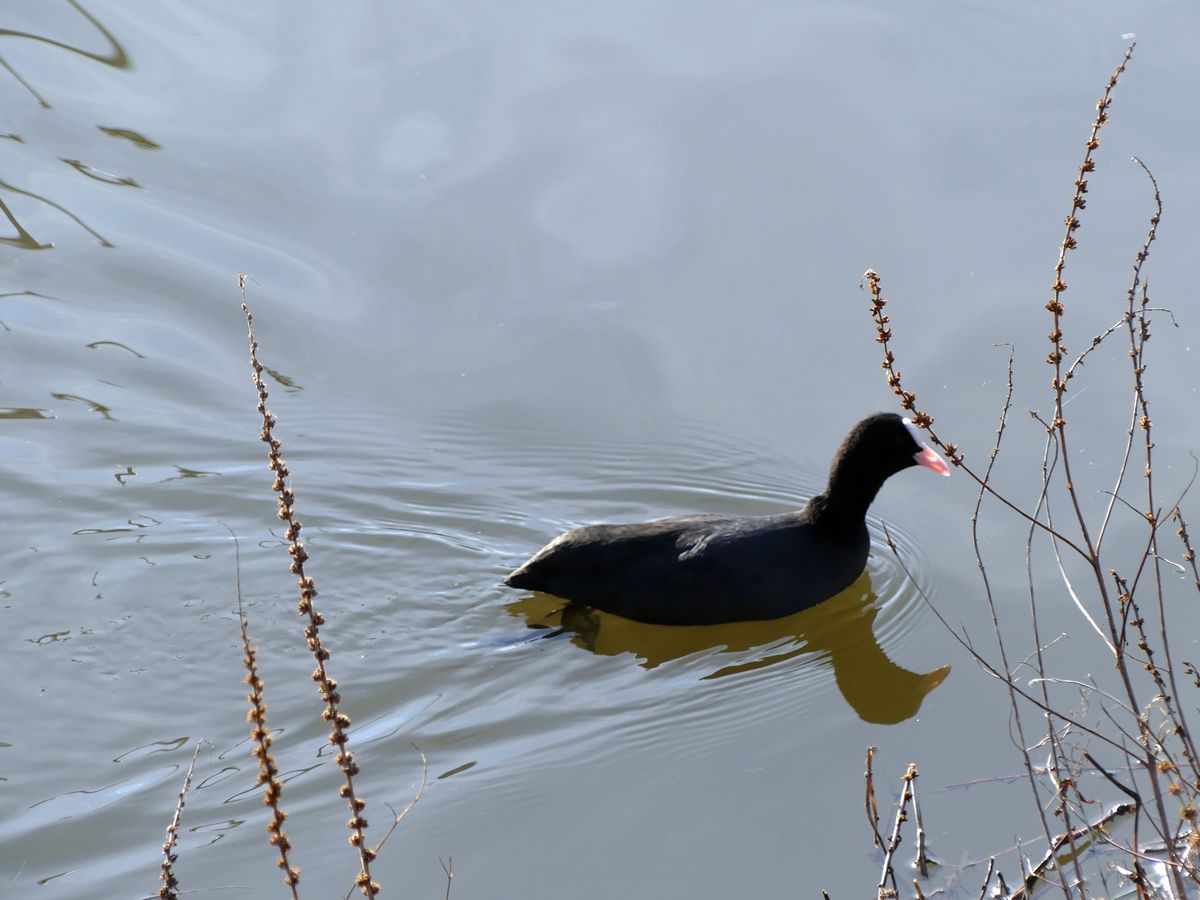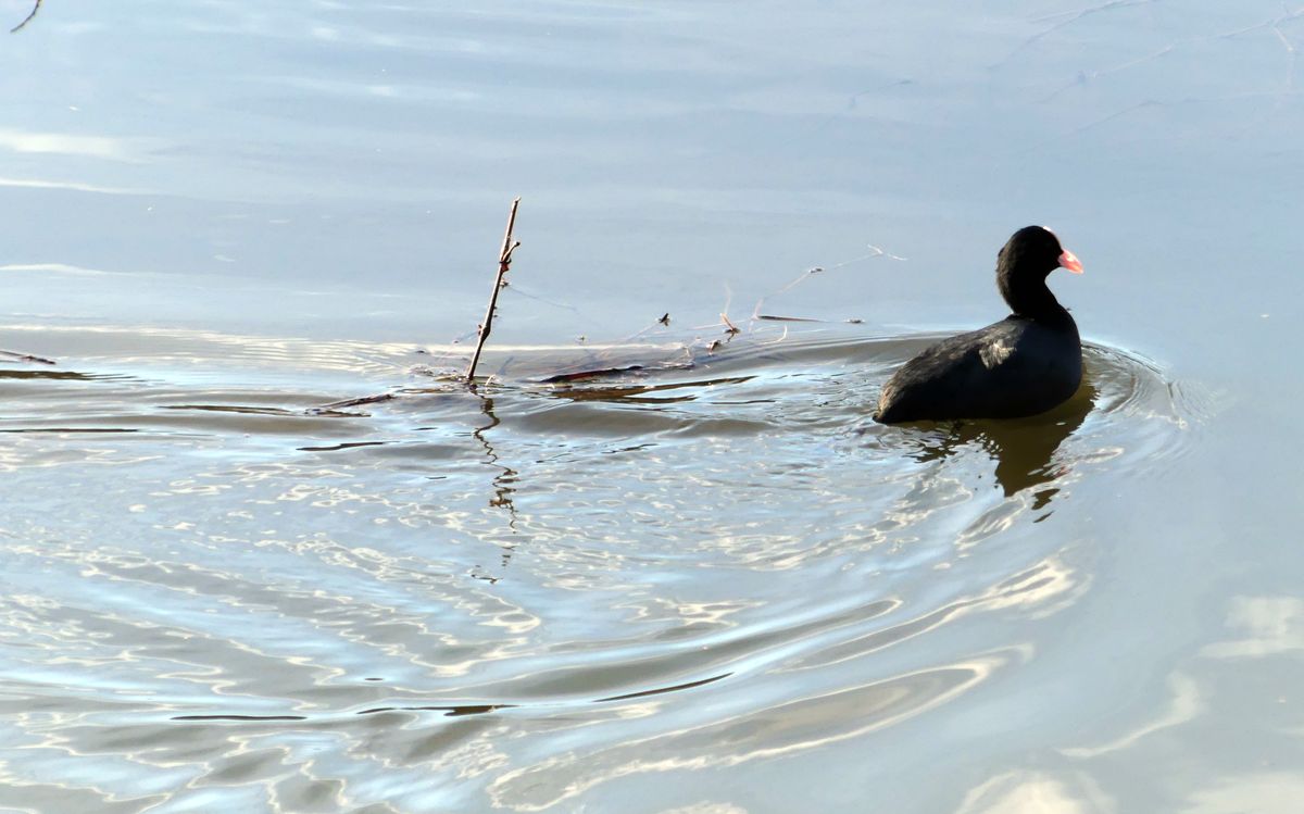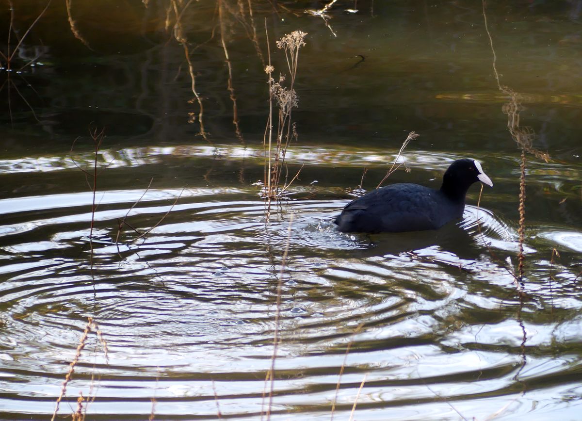 J’ai changé de sujets d’observation quand j’ai entendu du bruit à ma gauche, dans l’eau. Une foulque macroule naviguant tranquillement a osé traverser le territoire d’une consœur. Même si elle ne faisait que passer, elle prenait trop son temps pour la maîtresse des lieux. Enfin, je dis « maîtresse », mais chez les foulques, comme chez les corvidés, aucun dimorphisme sexuel franc. Une course poursuite s’est engagée, pour se terminer tout aussi rapidement.