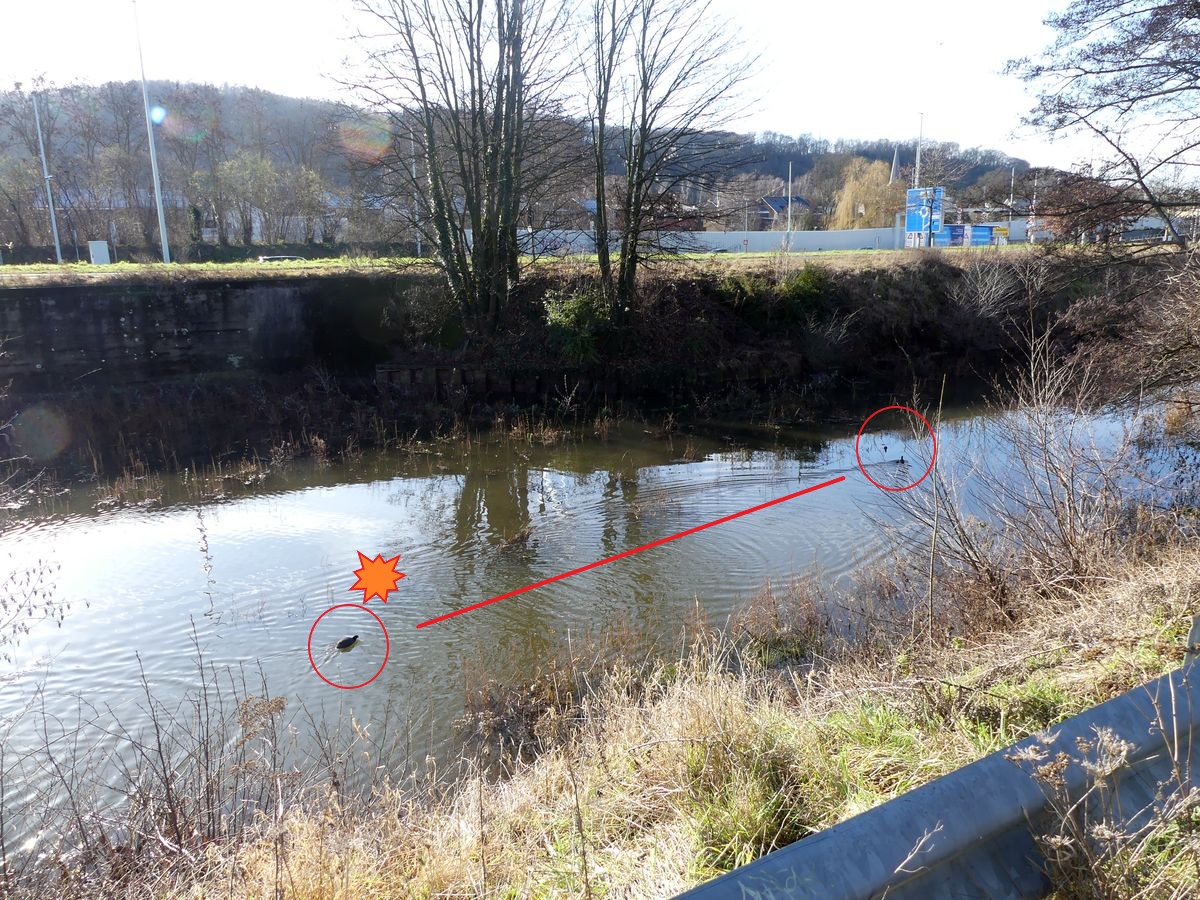Toutes les petites bêtes volantes ou rampantes sont aux abonnées absentes en cette heure du midi. Je ferai ma première photo bien plus loin, sur le canal de l’Ourthe : un petit bouchon. Non, deux. Que dis-je ? Trois ?! Mamamia, c’est bien ça : trois grèbes castagneux ! Mais ils sont loin. Très loin. Et petits. Très petits. Juste pour la forme, je fais quelques photos, car sait-on jamais, par hasard, j’aurais aussi le martin-pêcheur sur l’une d’elles ! Je peux toujours rêver… Il a filé comme seul le martin-pêcheur sait le faire : telle une flèche bleue, rapide comme l’éclair. On a juste le temps de se dire « Ah, c’était Martin ? » qu’il est déjà trop loin…