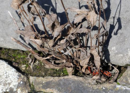 En lieu et place, là où je croyais en voir, j’aperçois un attroupement de gendarmes. Non pas ceux venus pour le boucher mal-aimé (les Belges me comprendront), mais ces insectes rouges et noirs de la famille des punaises. Clic-clac, une photo quand même, à défaut des lézards. Ces punaises restent normalement aussi cachées en hiver, mais ne dédaignent pas un bain de soleil hivernal, comme aujourd’hui.