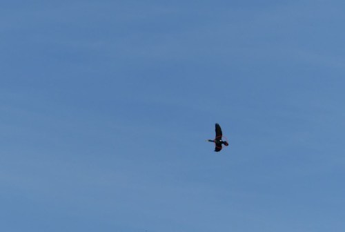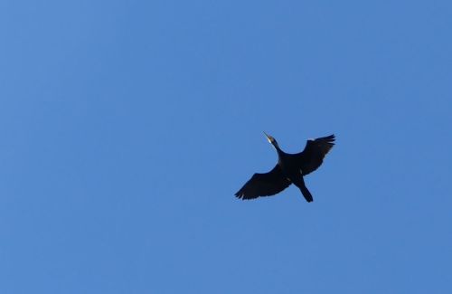 Encore un cormoran en vol. De plus haut, de plus loin. Mais vous pouvez voir, même d’aussi loin, la tache blanche sur son corps noir. Un adulte au plumage nuptial.