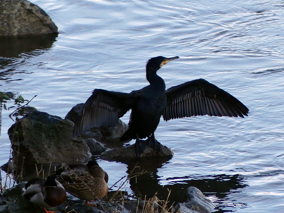 Je pourrais aller de l’autre côté de l’eau, mais c’est moins agréable. Et puis, je fais bien. Au moment où je m’assieds trente secondes pour boire à ma gourde, je discerne un grand cormoran, en bas, au bord de l’eau.