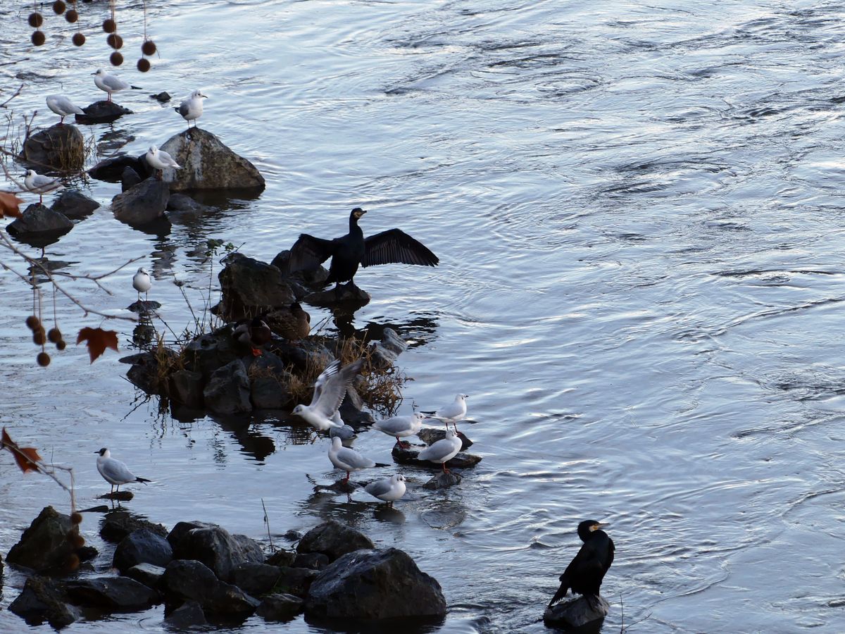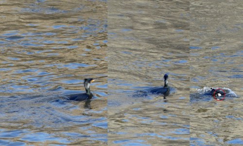 Après trois ou quatre photos, je poursuis ma balade. Plouf ! Un poisson ou un oiseau a plongé dans l’eau. Je me mets derrière un arbre, je me cache comme je peux (il y a plein de cyclistes et de joggeurs qui me dépassent) et j’attends. Hop ! C’était un grand cormoran en pleine pêche. Celui-ci est un adulte avec déjà son plumage nuptial. On le distingue bien avec son cou blanc et la tache blanche sur son épaule, que j’ai réussi à capturer juste au moment où il replongeait ! On la verra aussi en vol sur une autre photo.