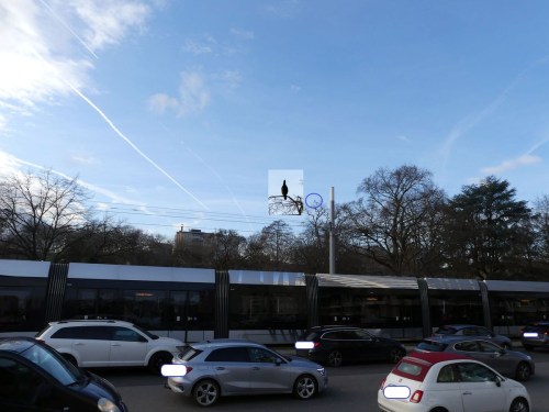 En dernières photos, un cormoran dans un arbre, au-dessus des voitures et du tram circulant…