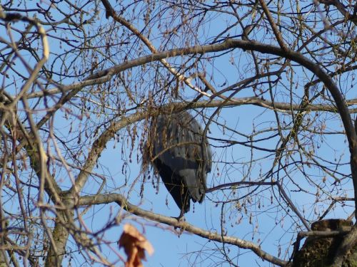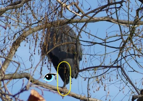J’aurais bien aimé rentrer à pied pour aller voir par l’autre chemin, mais mon corps ne le veut pas. Alors, ce n’est qu’une fois à la maison, en regardant les photos via l’ordinateur, que la vérité éclate : c’est un héron cendré, bien vivant, qui a froid ou qui dort tranquillement ! En zoomant sur l’écran de l’ordinateur, on voit très clairement la patte, au moins une patte, avec les doigts qui accrochent la branche de l’arbre.