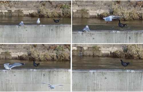 Des mouettes rieuses, en nombre, avec des grands cormorans, aussi en nombre, mais un peu inférieur quand même. Tout au bout, sur le muret de la cascade, une poule d’eau. Elle marche sur le muret. Deux mouettes sont posées non loin, une couchée, l’autre debout. Quand la poule d’eau arrive à leur niveau, hop, chacune s’envole à tour de rôle. C’est marrant. La poule d’eau est nettement plus petite que les mouettes, mais elle en impose par ses couleurs de notre nation : noir, jaune, rouge.