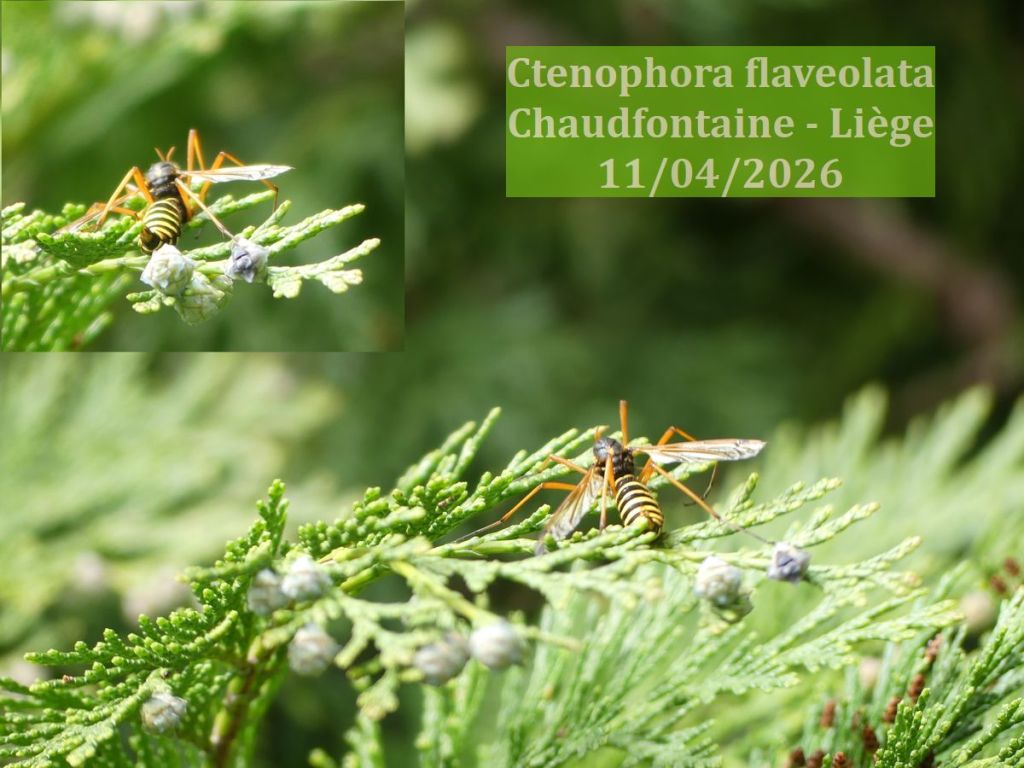 Ctenophora flaveolata est un diptère de la famille des Tipulidés. Contrairement aux guêpes, elle est totalement inoffensive : pas de dard, pas de venin, pas même l’intention de vous faire du mal. Son mimétisme est dit batésien du nom du naturaliste anglais Henry Walter Bates qui l’a décrit au XIX° siècle : une espèce inoffensive copie l’apparence d’une espèce dangereuse pour bénéficier de sa mauvaise réputation sans en avoir les moyens. Un bluff, en somme. Et un bluff qui fonctionne !