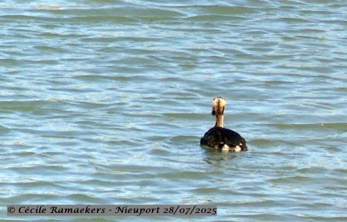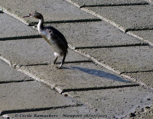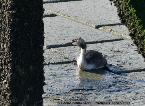 La séquence dure cinq à six minutes, largement le temps de prendre des photos et de filmer deux courts instants. Le grèbe n’est pas fait pour marcher : ses pattes palmées sont conçues pour nager et plonger, implantées très en arrière sur le corps. Sur le moment, je pense qu’il s’agit d’un jeune qui n’a qu’une seule envie : se sécher au soleil. L’obstination de la jeunesse fait qu’il s’entête à grimper sur les pierres. Il nageait correctement, il plongeait, il a volé sans difficulté. Ses chutes semblent plutôt dues au manque d’appui, ses pattes posées parfois entre deux pierres, que témoignant d’une blessure grave. Il était seul, pas harcelé par les autres oiseaux. Après une dizaine de pas maladroits, il s’arrête, se repose quelques secondes au soleil, puis il vole jusqu’au bord de l’eau et se couche, avant de regagner la surface.
