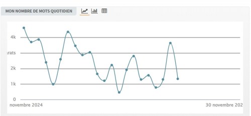Le graphique ci-dessus est hyper important pour moi. Il me ressemble tellement ! Mon humeur et mon énergie, ma motivation et mes idées/envies sont comme cette courbe qui monte et qui descend (les montagnes et les vallées représentes le nombre de mots par jour que j’ai écrits). Dans ma tête, c’est tout à fait ça, ça monte et ça descend, parfois du jour au lendemain…