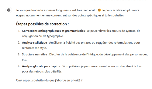 Ces deux derniers jours d’écriture ont été différents. Comme une urgence. Je regardais mes petits cartons « plan » collés au mur. Pour chaque jour, un conte à détourner, une idée à creuser, un chapitre à écrire. Et les images défilaient à la vitesse d’une F1 : à toute allure ! Mes doigts n’arrivaient pas à pianoter assez vite sur le clavier pour accoucher de toutes ces scènes qui se pressaient derrière mes rétines excitées. Pourtant, j’écris « comme une mitraillette » dit ma fille. Je tape à l’aveugle, je connais l’emplacement exact de toutes les touches de mon clavier, sans devoir le regarder. Mais ça n’allait toujours pas assez vite. Et puis, je zappais des détails, des phrases entières étaient oubliées, des scènes passées aux oubliettes. Je notais des mots-clés, des lieux, des prénoms, des couleurs, des noms d’animaux, des émotions, des dates. Tout se bousculait sous mes doigts. Embouteillage d’idées, bouchon de scènes. Tout ça sentait la fin et je ne la voulais pas bâclée. Jusqu’au bout, c’est-à-dire jusqu’au 20 novembre, j’ai respecté mon plan en écrivant une scène, un conte détourné par jour. Mais hier, le 21, je ne travaillais pas, donc assez contradictoirement, j’avais le temps. Et c’est parce que j’avais le temps que mon cerveau s’est complètement laissé aller et m’a montré plusieurs chapitres les uns à la suite des autres. Comme dans une BD, de la fumée (de mots) sortait par mes oreilles, mon cerveau était en surchauffe. La structure à respecter n’était plus là, la ligne d’arrivée des 50 k de mots était toute proche : J20 : 47.313 mots. Je savais que j’allais y arriver, mais je pensais mettre plus de temps. En 12 ans de Nano (je n’y ai pas participé chaque année, mais, avec les camps en avril et juillet, je m’y suis essayée à 13 reprises ! Toutes n’ont pas été officiellement suivie sur le site du Nano (7x). Ce n’est que la deuxième fois où j’arrive à 50.000 mots ! La première fois, c’était mon premier Nano, en 2012. Je me souviens parfaitement avoir péniblement réussi à atteindre 50.006 mots au 30 novembre. Je me souviens aussi très bien ne pas avoir écrit tous les jours, et surtout avoir bâclé la fin, car ça devenait trop long pour moi ! J’ai vraiment écrit n’importe quoi pour la fin de ce Nano, je n’ose même pas la relire !! Aujourd’hui, douze ans plus tard, je ne voulais pas faire la même erreur. Je sentais que la fin allait m’échapper, n’allait pas être bonne, brouillonne, jetée comme une malpropre sur l’écran blanc de mon ordinateur. Alors, le 21 novembre, quand j’ai vu que j’avais juste noté des mots-clés, des dates, des lieux, des animaux et prénoms de personnages, j’ai fait une pause. Je me suis fait un thé, mon thé du matin et j’ai… tourné en rond dans mon salon endormi (il était 4h48 du matin !). Puis, revenant à mon ordinateur, j’ai ouvert un nouvel onglet, celui consacré à Chat GPT. Je l’utilise deux fois par semaine pour demander à créer une image pour illustrer un passage ou un chapitre. (je pense que je vais poursuivre cette idée d’illustration par chapitre pour égayer mon livre). Et là, j’ouvre une nouvelle discussion et je lui demande « j’écris une histoire avec des contes détournés. Mais je me sens coincée pour la fin, je ne sais pas comment l’aborder. Pourrais-tu m’aider à écrire un chapitre avec bla bla bla » (là je détaille un peu mon histoire, je le résume et je demande ce que je veux : héroïne qui rencontre telle personnage, détournement de tel conte, tel animal comme ceci, un autre comme cela, avec l’arrivée d’un coup de théâtre comme ceci, en faisant le lien avec les émotions de mon héroïne et de ses questions, de sa quête, etc.). Bon, j’avoue que j’ai dû écrire au moins 500 mots pour décrire à Chat GPT mon histoire, où je me sentais coincée et où je voulais arriver. C’était très mal écrit, mais toutes les infos et idées étaient présentes. Et là ! Incroyable ! Génial ! Il a réussi à suivre mes idées mélangées, tortueuses, il m’a comprise, il a su me guider comme je le souhaitais, m’amener où je le voulais. En plus bref, parce que moi je suis une grande bavarde et parfois je me perds dans des détails inutiles. Le meilleur, je trouve, dans tout ça, c’est qu’il me proposait même une suite avec plusieurs propositions !! Mais je ne voulais pas de ses suites à lui. J’avais mon idée et j’allais lui demander de m’y emmener. Ainsi, la fin de cette histoire, je dois la partager avec l’Intelligence Artificielle ! Je n’en ai pas honte. Je n’ai pas fait des copier-coller, mais j’ai utilisé sa concision pour arriver à mes fins, à ma FIN. J’ai réécrit, j’ai adapté, j’ai corrigé, j’ai changé des mots, des phrases, des descriptions. Et, surtout, maintenant que j’ai toute l’histoire écrite, dans son entièreté, j’ai une vision plus globale du squelette et je vais, oui, j’ai envie, de corriger des passages, de rajouter des scènes !