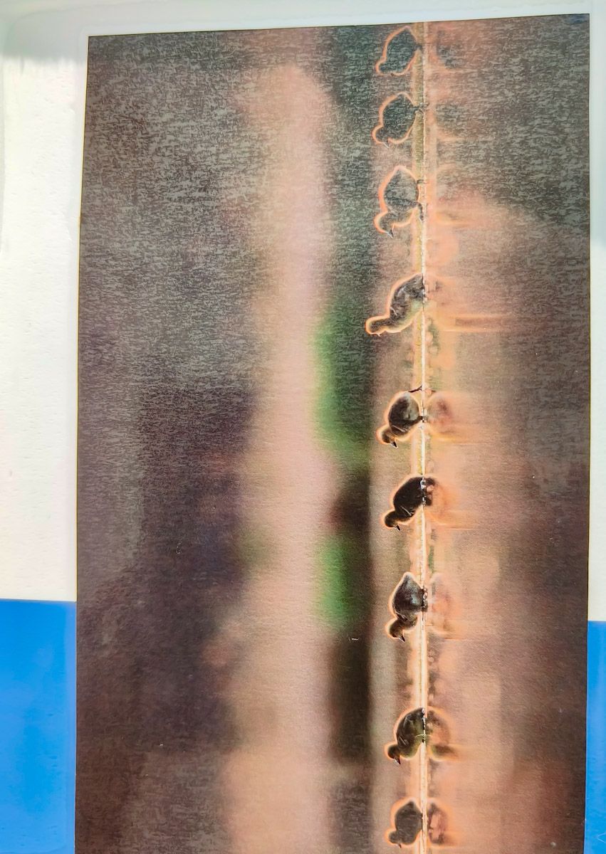 J’ai essayé de ne pas trop réfléchir quant au choix des images et des mots que j’ai découpé dans différentes revues « zen » et « nature ». Bien que l’image du dos du cahier soit dans le mauvais sens, je l’ai quand même choisie, car j’aime tous ces petits poussins à la queue leu leu, ils avancent les uns derrière les autres, doucement, à leur rythme. Ils montrent qu’il ne faut pas se presser et qu’il faut attendre que celui devant soi avance pour pouvoir avancer à son tour. Comme des objectifs ;-)
