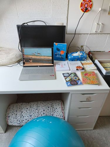 Comme vous pouvez le voir, j’ai un ballon en guise de siège. Pour mon dos, c’est meilleur. J’ai mis un gros coussin/boudin pour y déposer mes petits petons et pour que mes genoux et mes hanches forment un angle droit, sinon, certaines tensions finissent par arriver. Je devrais surélever mon portable et mettre un clavier sans fil pour que ma tête soit droite. Heureusement, je tape à l’aveugle et je peux laisser ma tête droite tout en continuant à pianoter sur les touches de mon clavier. Continuons la visite. Sur le bureau, tout à gauche, vous pouvez apercevoir un coussin « hibou » fait mains par ma maman. Le coussin était pour mon fils, mais son chat en a pris possession et depuis la miss Héra dort là-dessus, très régulièrement. Au moment de la photo, j’ai pris quelques livres sur le sujet de l’écriture. Vous pouvez voir en premier plan, un carnet que j’ai personnalisé pour mes objectifs. Enfin, tout en haut, à gauche de la photo, à côté du bureau, sur une armoire, une boîte de puzzle vide. Le must pour les chats. A peine mis là, hop, y en avait déjà un qui squattait la place.