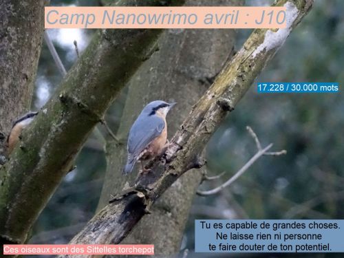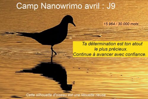 Nous ne sommes même pas à la moitié du mois d’avril, que je commence à ressentir une habitude à me lever tôt et à m’installer devant le clavier de mon ordinateur. À pianoter une heure durant et à comptabiliser les mots puis à encoder le chiffre sur le site officiel du Nanowrimo. Ensuite, j’aime personnaliser une photo d’oiseau pour partager ma progression avec des chiffres et un petit mot d’encouragement.