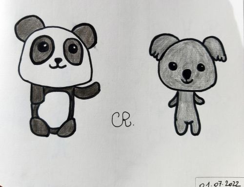 Et comme je n’ai pas pu attendre le 4 juillet pour commencer à dessiner, voici mon premier dessin, mes premiers dessins. Le panda n’est pas parfait, mais ce sont ces petites imperfections qui font toute sa personnalité (rires). De plus, l’encre a coulé à deux endroits quand j’ai commencé à gommer les traces de crayons. Ce n’est pas grave, j’ai pris plaisir à lui donner vie.