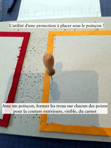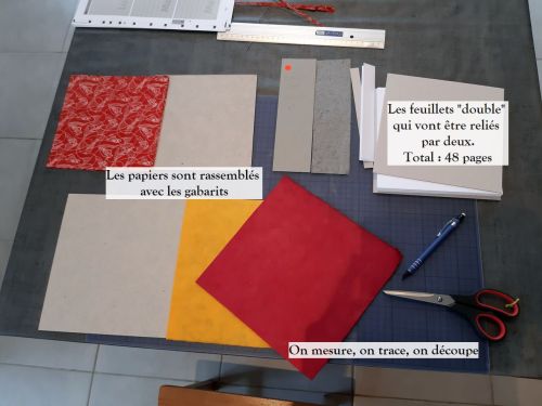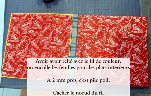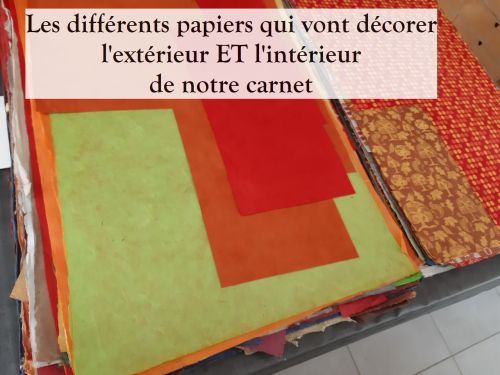 Nous sommes passées par toutes les étapes de fabrication du carnet. Depuis le choix et la découpe des papiers qui vont embellir la couverture, au choix du fil qui va décorer la reliure des plats jusqu’à l’encollage de tout cela et la couture des feuillets. Les feuillets (Bristol) étaient déjà là, prêts à l’emploi, déjà découpés aux bonnes dimensions. Là aussi, il existe plusieurs choix de papier intérieur, mais on a voulu faire au plus simple pour commencer (rires).