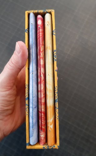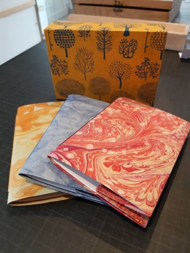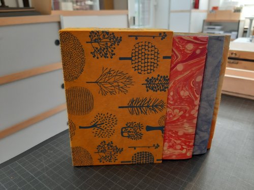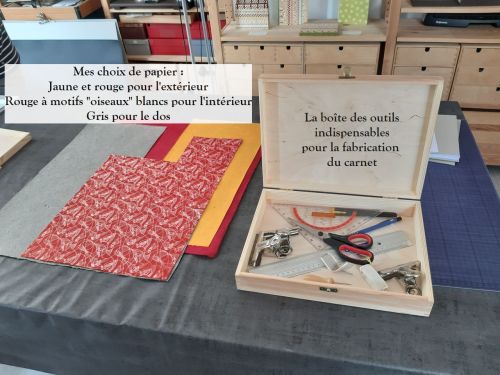 A l’atelier, à notre arrivée, tout était prêt pour nous : une grande table avec de grandes feuilles de différentes couleurs et de différentes textures pour emballer les cartons qui formeront la couverture et le dos de notre carnet. Une boîte en bois pour chacune de nous deux, avec à l’intérieur tout le nécessaire pour cette activité. De la colle. Un pressoir. Des carnets exposés terminés. Des fils de couture de toutes les couleurs, …
