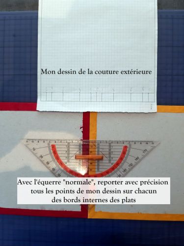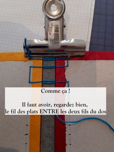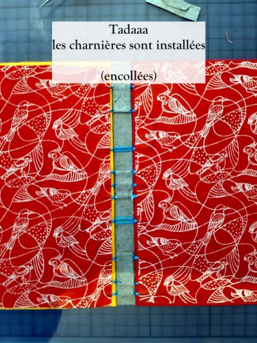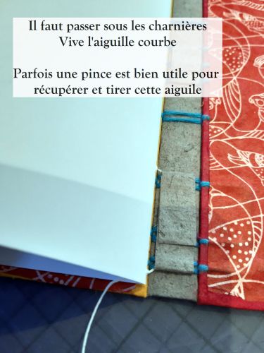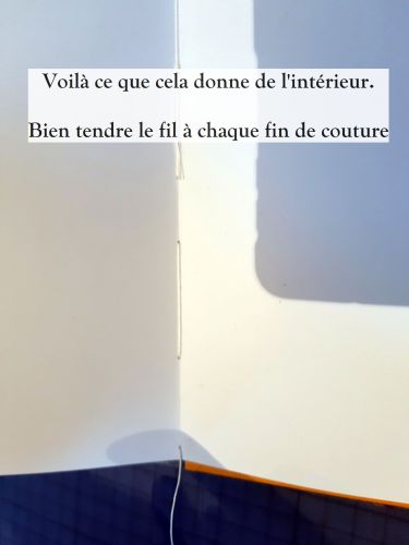 Quant à la couture des feuillets avec le fil de lin hyper solide, spécial fil de reliure, ça n’a pas été une mince affaire non plus. Le fil, certes solide, n’arrêtait pas de s’enrouler et de faire des tourbillons et donc … presque des nœuds ! Ensuite, faire passer l’aiguille courbe sous les charnières que nous avions mise en place, vraiment pas évident non plus. Mais quel plaisir, quelle joie immense de voir qu’on a réussi.
