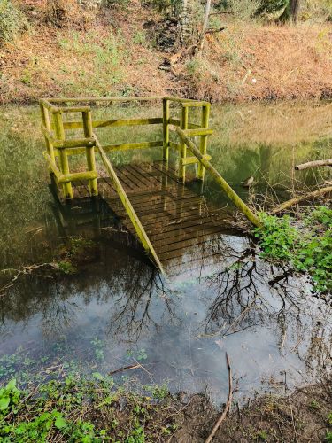 Il est 9h. J’arrive presqu’au bout de ce deuxième tronçon, au-delà du parc Hauster, non loin du Grand Casino de Chaudfontaine. Un bras de La Vesdre, qui était quasi à sec il y a moins de deux mois, déborde légèrement. Elle n’est pas encore sur le chemin, mais elle a déjà pris le dessus du petit passage en bois qui est installé dans l’eau et au-dessus de celle-ci. Il y a eu beaucoup de précipitations il y a 3 à 4 semaines et un orage avec de la grêle et des trombes d’eau, de courtes durées heureusement, 48 heures plus tôt.