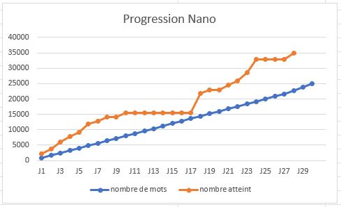 Des idées, j’en ai pleins. Des histoires que j’ai envie d’écrire, un peu moins. Des démarrages rapides et incroyables, souvent. En avril 2022, j’avais très bien écrit durant les dix premiers jours. Je m’étais fixé le but des 25.000 mots. Pour me booster, j’avais décidé d’intégrer 30 titres de livres. Du J11 au J18, je n’ai plus rien écrit. Puis j’ai repris un peu. Pour stagner encore un peu plus tard. En réalité, j’ai été prise par les personnages de mon histoire, et une fois que j’avais la fin en tête, ma motivation à écrire est retombée comme un ballon de baudruche dégonflé. Mais je suis arrivée au but et je l’ai même dépassé, sans pour autant atteindre l’objectif du Nano.
