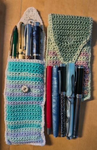 Et parce qu’écrire est un plaisir autant qu’un rituel, je prends soin de mes outils. J’écris au stylo-plume, avec des encres colorées, et mes précieux compagnons d’écriture sont bien à l’abri dans deux jolies trousses en crochet, confectionnées par ma maman.