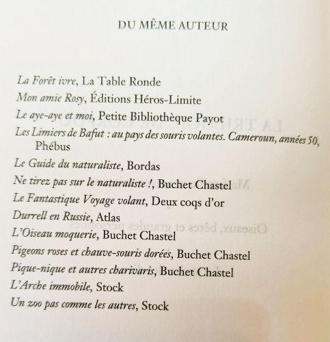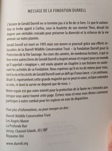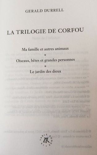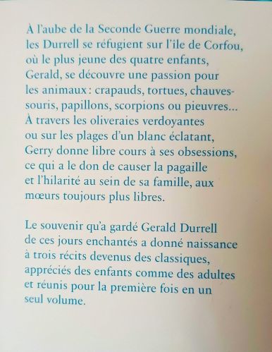 Ses livres « Un Tanguy chez les hyènes » et « La cigale et le zombie », je les ai déjà lus. Mais dès le début de sa conférence, il nous a parlé des trois éthologues du XXe siècle, dont celui que j’aime particulièrement et dont j’ai lu presque tous ses livres : Gérald Durrell. Et voici un de ses gros ouvrages qui a été réédité il y a peu, qui réunit trois livres : La trilogie de Corfou