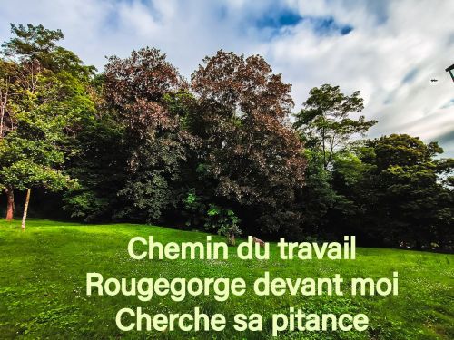 Pour la petite histoire du Rougegorge. C’était hier. Assise à la table du salon, devant la fenêtre, j’ai une super vue sur l’arbre côté rue. Il y vient pas mal de visiteurs, en toutes saisons. Une bande de petits moineaux domestiques, au nombre de quatre ou cinq, arrivent les premiers. L’arbre qui déjà fin de l’été perdait ses feuilles, a connu brièvement une deuxième floraison en octobre ! Les baies sont là, les branches sont nues de feuilles, les bouquets de fleurs du mois passé sont tout secs, rabougris et secs. Les moineaux sont bien visibles, ils sautillent et volettent par-ci, par-là. Une poignée de secondes s’écoulent pendant que je les observe. Le temps qu’il faut pour qu’un couple de merle, Monsieur tout noir, Madame toute brune, arrive à son tour. Suivi immédiatement par un rougegorge. Ce petit dernier, n’a pas le temps de profiter de la vue et de découvrir ses voisins qu’il est pourchassé par un moineau, puis par un deuxième. Heureusement l’arbre et grands et il a plein de branches. Le rougegorge fuit sans s’en aller de l’arbre. Mais c’est sans compter sur les merles ! A leur tour, ils volent derrière le pauvre rougegorge. Il n’a pas trente-six solution, il quitte l’arbre et s’en va voir si l’arbre des voisins est plus accueillant. A côté, le même arbre, plus jeune, a encore la plupart de ses feuilles qui jaunissent petit à petit. Je ne verrai plus le rougegorge. Les moineaux et les merles cohabitent bien les uns près des autres.