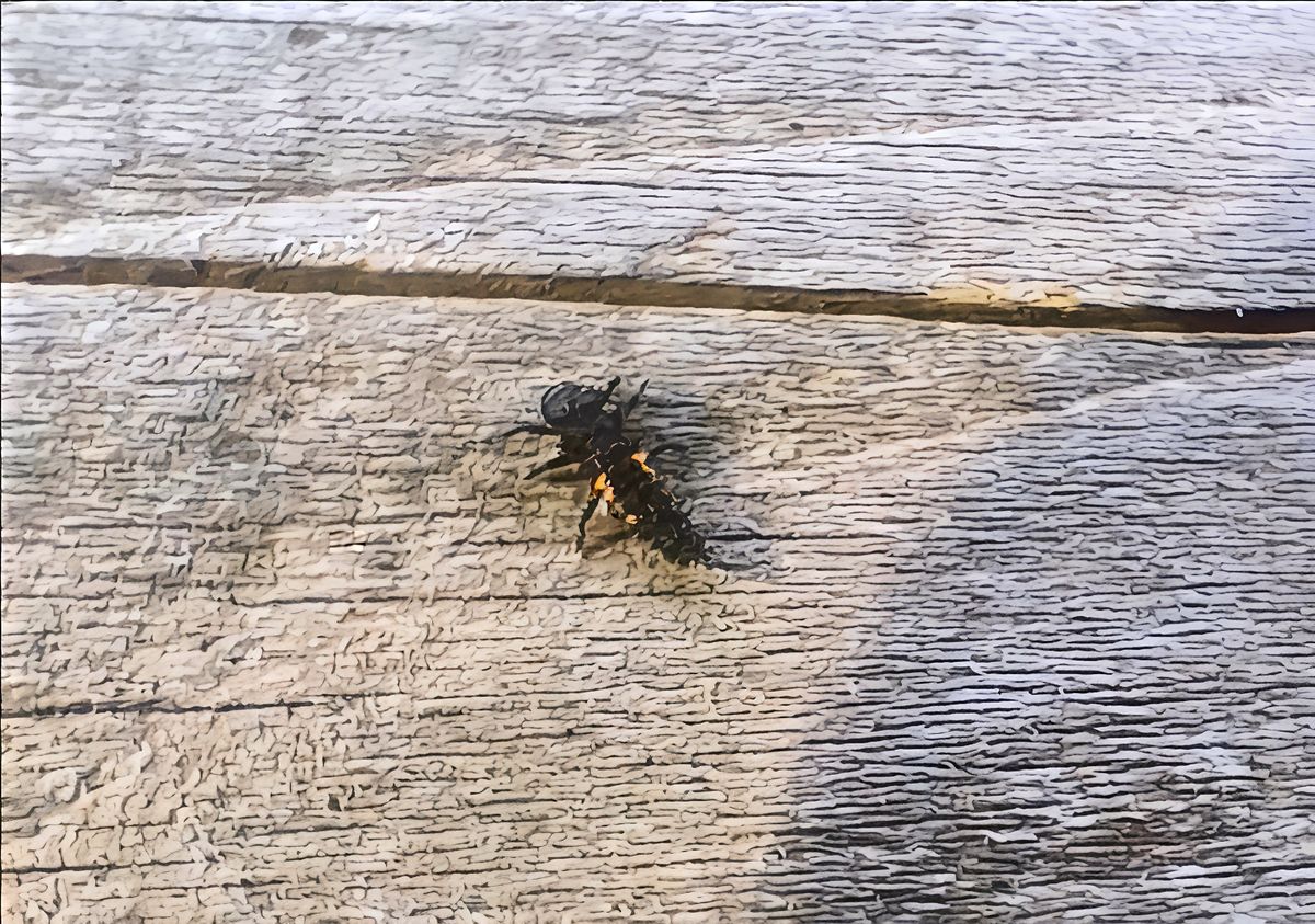 Ses longues antennes me font hésiter, Je tends la main, pour le sauver. Hélas, il ne bouge plus d’une patte, Figé, brillant, sous la lumière plate.