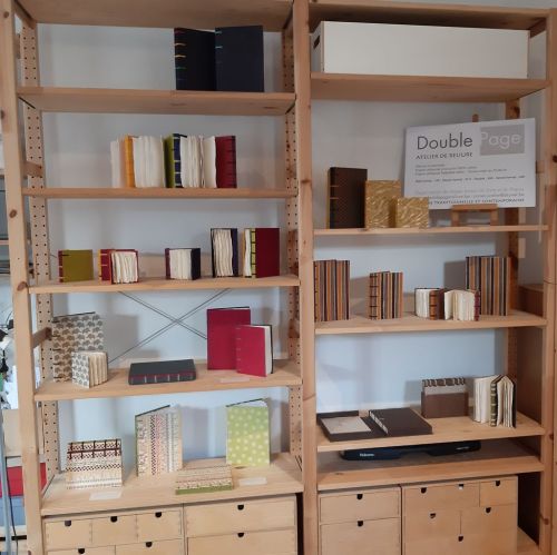 Des carnets reliés de différentes manières, des armoires en bois, ambiance cocoon et chaleureuse