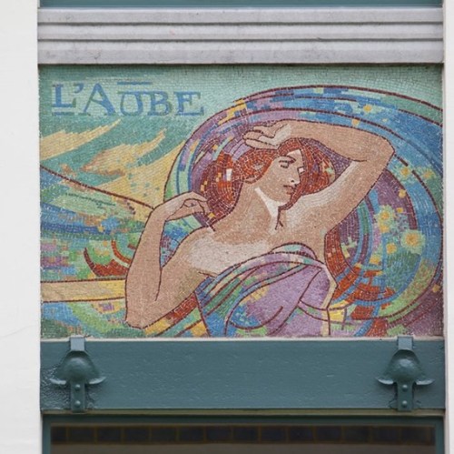 Curieuse, je consulte quand même Wikipedia (!) et je lis : “Cette mosaïque est l’œuvre d’Auguste Donnay, On perçoit un contraste entre la sérénité du personnage et les éléments qui, autour, se déchainent.