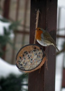 Après que l’enfant soit rentré, le Rougegorge bouge une, puis les deux pattes. Trois petits bonds et le voilà à terre picorant les premières graines, puis s’envolant sur la boule de graisse.