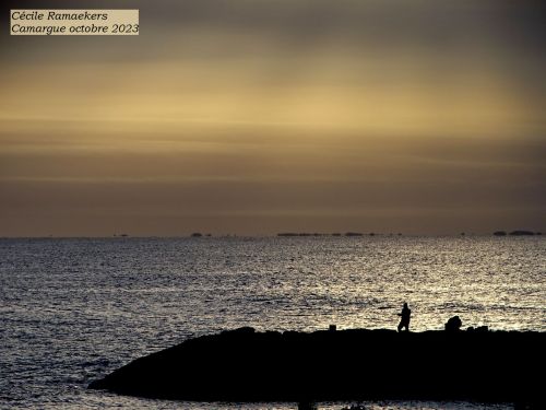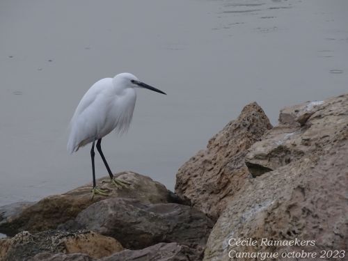Le parc ouvre ses portes à 9h. Levée tôt, comme à mon habitude, je décide de d’abord faire un tour sur la plage des Saintes Maries de la mer, pour voir si les Aigrettes garzettes se donnent toujours en spectacle et aussi, surtout, pour essayer de faire de plus belles photos de ces Tournepierres à collier que j’avais eu brièvement le temps d’apercevoir au tout début de notre longue balade du mardi. Je ne savais pas de quelle espèce il s’agissait. Entre-temps, j’ai eu le temps de regarder sur le net pour les identifier : des Tournepierres à collier. Le soleil se lève avec quelques gouttes de pluie. Il y a un paquet de Tourterelles turques (photo). Je mets un bon quart d’heure pour arriver à l’endroit désiré. Étonnée de croiser plusieurs personnes, joggeurs et maîtres qui sortent leur chien pour la première balade du jour. Deux pêcheurs également sont déjà sur place. Mon regard embrasse large et je discerne immédiatement trois oiseaux différents posés à un même endroit. Le temps d’un clic et le goéland décolle. Les aigrettes sont toujours là. La scène est répétée. Une troisième arrivera peu après, mais elle se fera rembarrer aussi sec. Des hérons cendrés? Des Grands cormorans. Deux ou trois Goéland leucophées. Le G. leucophée et le G. argenté se ressemblent très fort, si ce n’est la couleur de leurs pattes différente, seul critère qui me permet facilement de les différencier. Le leucophée a les pattes jaunes tandis que l’argenté les a rose.