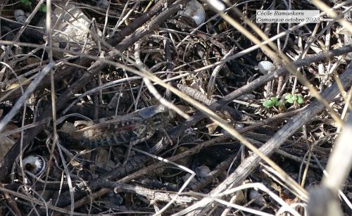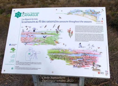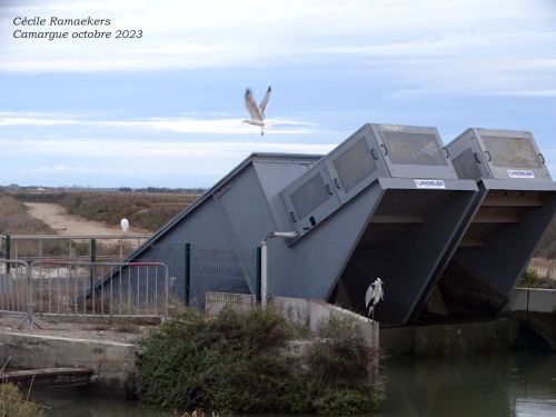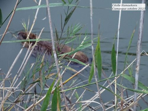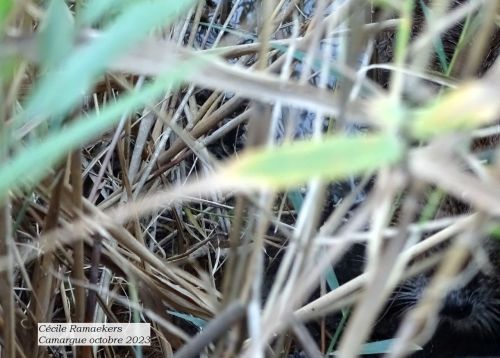 8h35, il est plus que temps que je rentre rejoindre mon amoureux pour aller aux marais du Scamandre. C’est quand même à trente minutes en voiture. 9h20, on loupe l’entrée de la réserve naturelle. 9h25, on gare la voiture dans le parking. Il fait mitiger. La fine pluie ne reste pas et la lumière du soleil a un peu de mal à percer la couche légère des nuages gris. Il fait 18°C. La température montera très légèrement pour atteindre 20 degrés fin de matinée. On aura été sur tous les pontons, chemins et « miradors » ou cabanes d’observation. Je n’aurais vu aucun autre héron que le cendré et la garzette (Aigrette). Un bruit incroyable nous a permis d’assister à un envol et un atterrissage d’un couple de Cygnes tuberculés. (photos floues « caca boudin » !) Mais j’ai été ravie d’apercevoir à quatre ou cinq reprises un puis deux Martin-pêcheurs, mais à chaque fois, en vol, avec l’impossibilité de les photographier. J’ai bien pris, je crois, un Milan noir en photo, mais de loin, très loin, très très loin. Enfin, grâce à mon compagnon, j’ai vu un Ragondin, mais mon appareil photo, en mode automatique « intelligent », a buggé sur les roseaux et végétation devant et n’a pas réussi à faire la mise au point correctement sur l’animal. Flute ! À plusieurs reprises, il y avait des panneaux nous prévenant de la présence d’un Butor étoilé (ce héron jaune trapu, massif et maître en camouflage – voir précédent article clic clic), mais hélas, trois fois hélas, je ne l’ai point vu. Je pense l’avoir entendu, il a un « glou » très caractéristique, mais je n’en suis pas moins sûre ! Malgré le peu d’oiseaux observés, c’était une agréable balade, dans un environnement calme, avec, à cette heure matinale, très peu de monde. Quand nous sommes sortis, sur les coups de onze heures, j’ai aperçu dans un champ, une poignée de Hérons garde-bœufs (petits hérons blanc et beige au bec orange qui sont souvent posés sur des ruminants, bovins, chevaux, taureaux pour picorer les insectes qui se trouvent en nombre sur ces grands animaux), posés droits sur des piquets ! Juste le temps de les remarquer, qu’on les dépassait et que je râlais de ne pas avoir eu le réflexe de déclencher mon appareil photo. Crotte de bique !