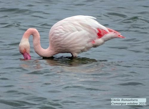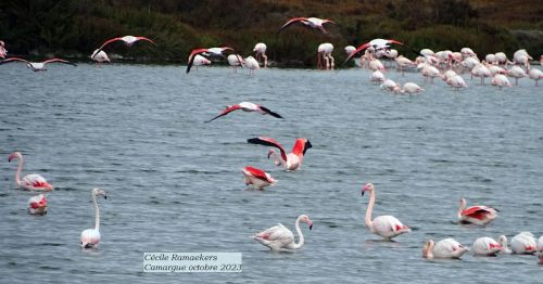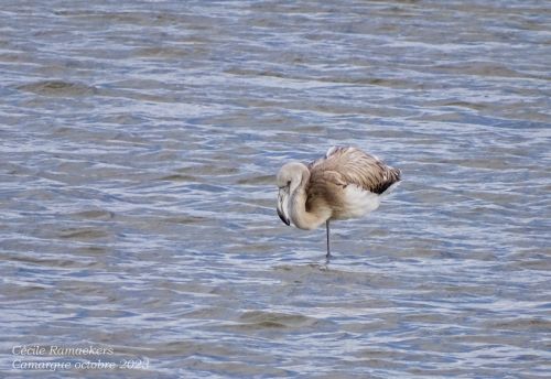 Le chemin est balisé. Il est fait pour les piétons (nous sommes les seuls sur le trajet à l’aller), les cyclistes (qui sont en nombre, surtout des familles avec enfants) et les cavaliers. Le ciel est partiellement couvert. La pluie est rare, mais régulière et le vent est toujours bien présent. Dès le début du sentier, je peux voir des limicoles dans les pierres qui jalonnent la plage : Gravelots ou Chevaliers ? Trop loin, ils n’arrêtent pas de marcher à une vitesse hallucinante. Je tente quelques photos, mais j’arrête d’essayer, car il y a déjà pas mal de cyclistes, pêcheurs et autres gens autour de moi et moi, je n’aime pas qu’on me « colle » de trop près. Un malaise s’installe et on poursuit notre balade, main dans la main. Rapidement, on voit Les Oiseaux emblème de la région : les Flamants rose ! Des centaines. Des milliers. Quelques individus un peu pâles, un adulescent et oui, encore un tout jeune, tout gris. Ce dernier est isolé avec (je suppose) sa maman.