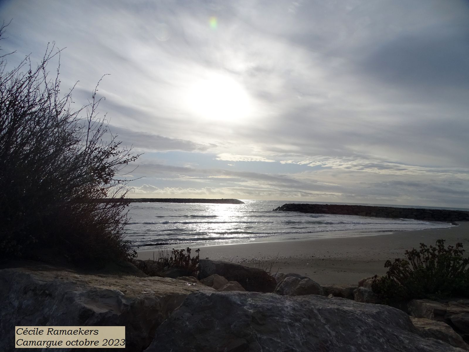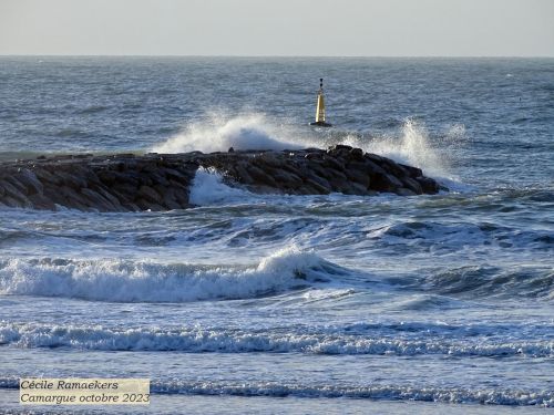 Super accueil. On dépose nos bagages et immédiatement après, on se dégourdit les jambes avec une balade sur le rivage et à l’intérieur de la ville. La route a été humide et frisquette; 10 à 12°C, pluie, purée de pois à couper au couteau et la météo en Camargue n’était guère réjouissante puisque des orages étaient prévus localement avec un vent soutenu. Heureusement, la température était bien meilleure ici : 22°C ! Nous abandonnons rapidement la plage, car les vagues s’écrasent sur les rochers et nous éclaboussent.