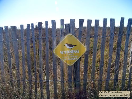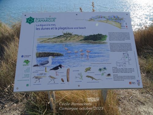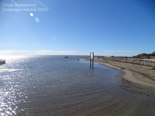 Après une vingtaine de minutes de repos, nous reprenons le chemin du retour. Le livre mentionne un retour sur le rivage à deux kilomètres du phare. Nous trouvons facilement le chemin. Nous l’empruntons en nous demandant si nous pourrons quand même passer par là étant donné les grandes flaques d’eau qui inonde partiellement le chemin. Nous arrivons sur la plage. L’étendue d’eau, avec le soleil, est splendide ! Il y a comme une minuscule île, que je prends en photo. Notre regard, au loin, est inquiet. Nous longeons bien la barrière en bois, mais nous ne voyons que de l’eau après. Plus de barrière, plus de bois. La végétation arrive encore à percer à la surface, à certains endroits. Prudemment, nous continuons lentement en nous disant qu’on devra certainement faire demi-tour, que les intempéries de la veille ont fait monter l’eau bien plus haut que prévu. J’espère que j’ai tort et qu’on pourra quand même continuer, pour ne pas prendre le même chemin qu’à l’aller. Dans les dunes, il y a une tente. Un peu plus loin, une pancarte expliquant sa présence (suivi d’insectes). Et encore plus loin, de l’eau. La mer. Ici. Là-bas. Partout. Mon amoureux me montre du doigt où nous devrions aller. Entre cette tache au loin et nous, la mer. On hésite à y mettre les pieds. Mais nous ne sommes vraiment pas équipés pour faire trempette avec nos appareils sur le dos. Grâce à mon zoom super puissant (optique + numérique), j’essaie de voir aussi loin que je le peux. Est-ce profond ? L’eau pourrait monter jusque où ? Impossible de donner une réponse. C’est à regret que nous rebroussons chemin et qu’on continue notre route, à pied, directement Saintes Marie de la mer.