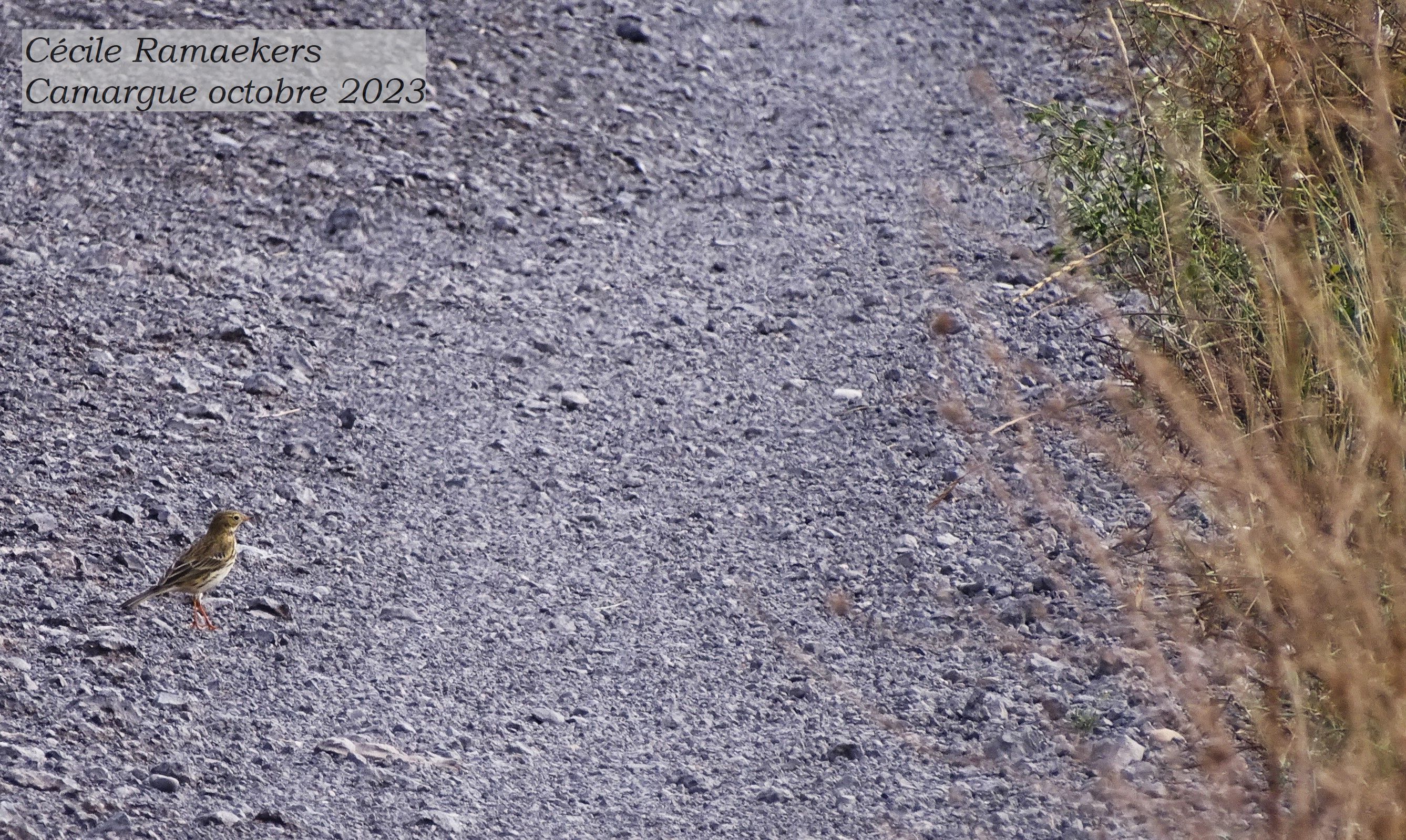 Sur le chemin, des dizaines de petits oiseaux. Des passereaux. Des petits oiseaux de la taille tantôt de moineaux, tantôt de petits merles. Des bruns et jaunes. Que je n’identifie pas tout de suite, car ils volent et s’envolent dès qu’on arrive trop près d’eux. Ils décollent des buissons qui longent le chemin et se posent plus loin, à l’abri des regards et des dérangements. Quand je peux, j’essaie de m’arrêter et de photographier. J’arriverai ainsi à immortaliser deux Cochevis huppés, deux ou trois Pipit farlouse et un Pinson des arbres, une femelle. Dans le ciel, je vois et j’entends une alouette.