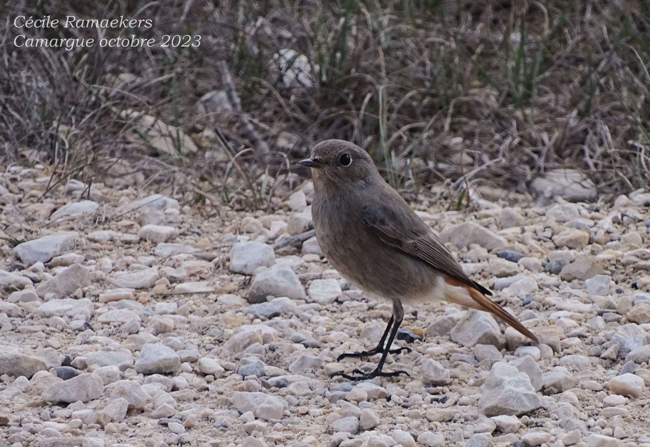 Les pancartes sont régulières. Nos pieds avalent les kilomètres sans trop s’en rendre compte. Jusqu’à ce que midi arrive. Voilà un peu plus de deux heures que nous marchons d’un pas tranquille, ponctué de courts arrêts pour regarder les oiseaux. Le phare est visible de très loin. Un petit point reconnaissable grâce à sa silhouette longiligne qui se détache du paysage. Petit à petit, il semble se rapprocher. Le chemin est sinueux, il tourne tantôt à gauche, légèrement, puis à droite. Le phare n’arrête pas de bouger (rires). Je dis, un peu en rigolant et vraiment par hasard, que nous arriverions au phare à 13h15. Je commence à bien sentir les muscles de mes cuisses. Ce n’est pas encore une douleur, juste une sensation, un rappel de leur présence. Après 10 kilomètres, c’est tout à fait normal. Les trois milles et derniers mètres pour atteindre le phare me semblent plus longs. De petits oiseaux bruns avec une queue rouge orangée volent de-ci, de-là. Des libellules rouge sang m’accompagne dans les derniers mètres. Il est 13h25 quand nous nous asseyons sur une plateforme, une sorte de puits fermé ou de citerne. Les petits oiseaux bruns avec leur queue rouge orangée sont moins farouches que les autres vus un peu plus tôt. Je peux leur tirer leur portrait sans problème. Je leur offrirai le trognon de ma pomme que je viens de manger en guise de déjeuner. Je n’ai pas reconnu immédiatement ces Rougequeues noirs, car je n’ai vu, ici, que des femelles. Ou des jeunes. Aucun mâle avec la moitié de la tête, la gorge, le poitrail, bien noir. Tous ceux que j’ai observés sont d’un brun uniforme avec le bas-ventre et le dessous de la queue rouge orangée.